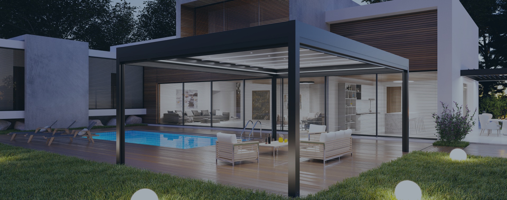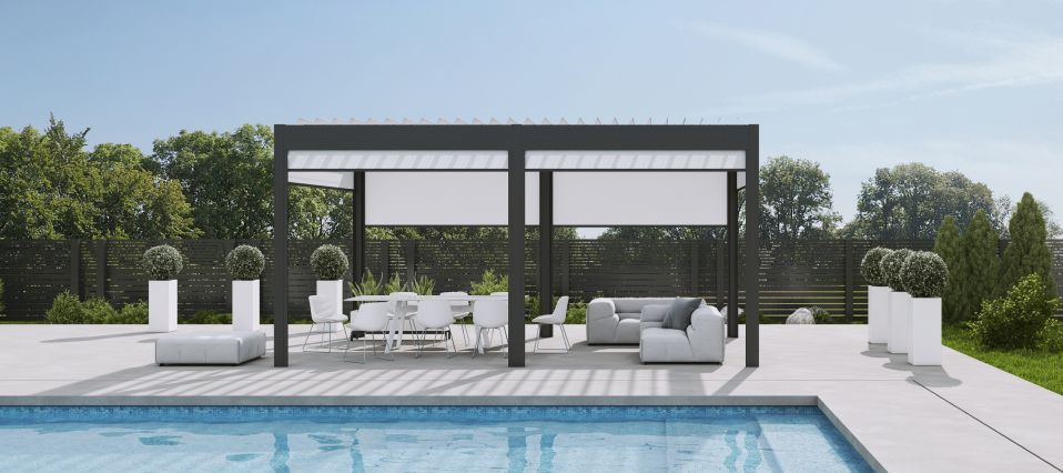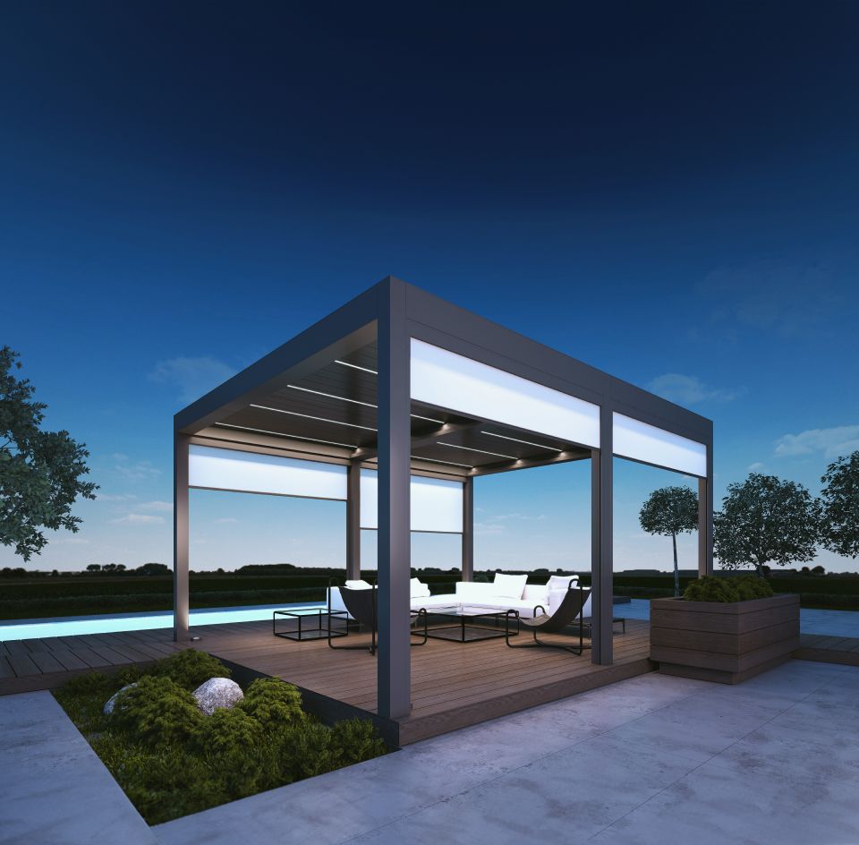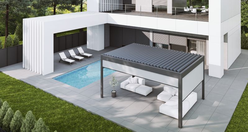 Lamellendach ist eine Alternative zur Markise. Mögliche Optionen mit Heizung, Regensensor, Beleuchtung oder Audiofunktion.
