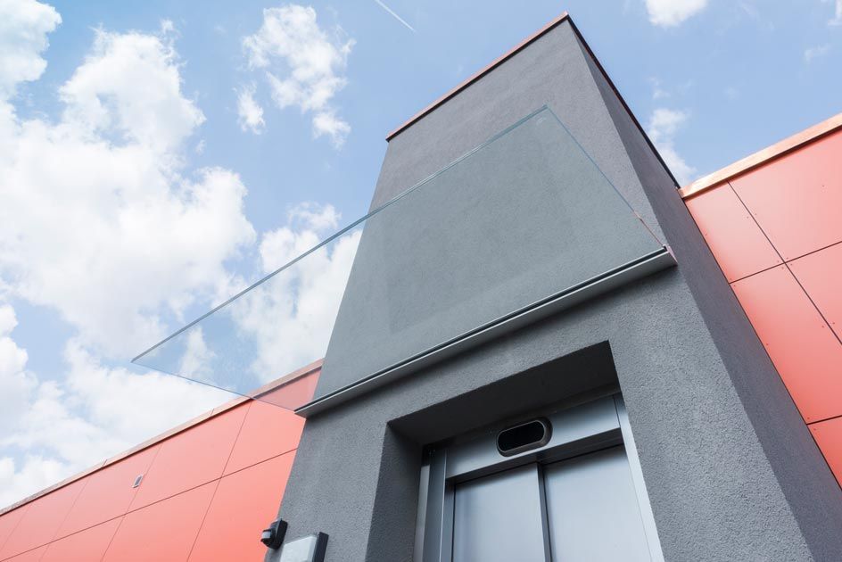 Freitragendes Vordach wird ohne Unterkonstruktion oder Aufhängung an der Wand angebracht. In der Regel Dank einer Schiene als Halterung.